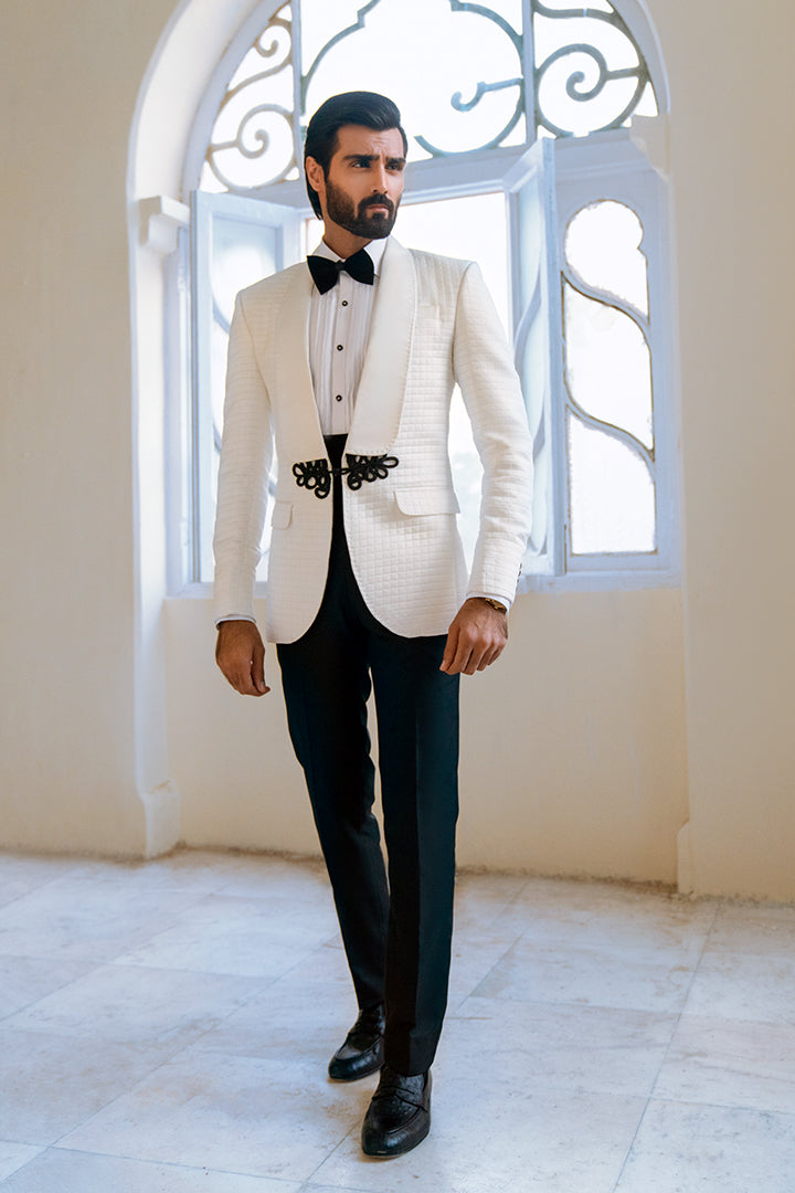 Off white textured fabric wrong Satan shwal lapel one button tuxedo front bunch