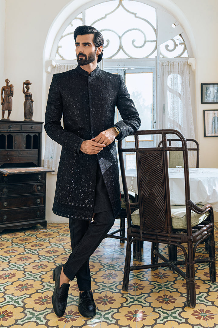Black sherwani full embroidery with sequnce work with front and sleeves border