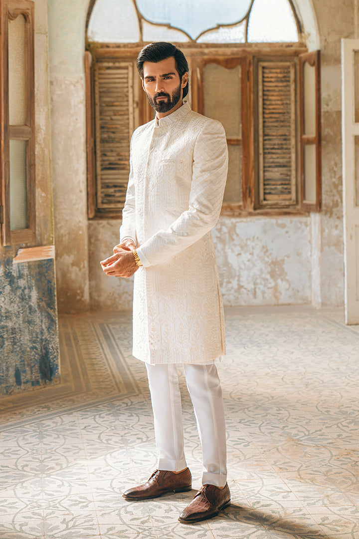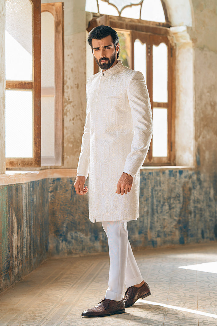 White sherwani full embroidery off white with detailing of sequnce work and with row silk kurta trouser