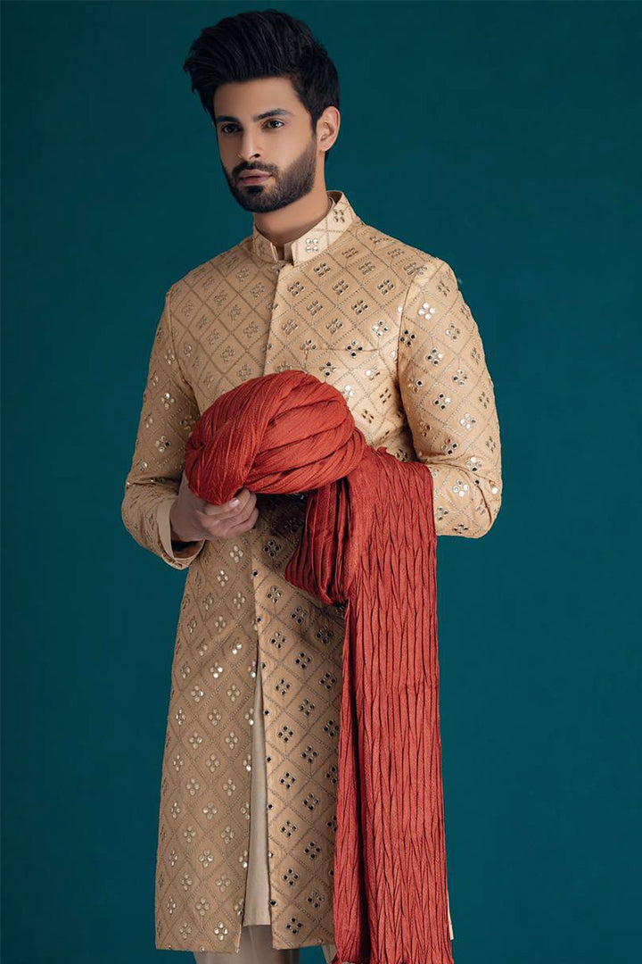 Golden sherwani embroidery with mirror foil work