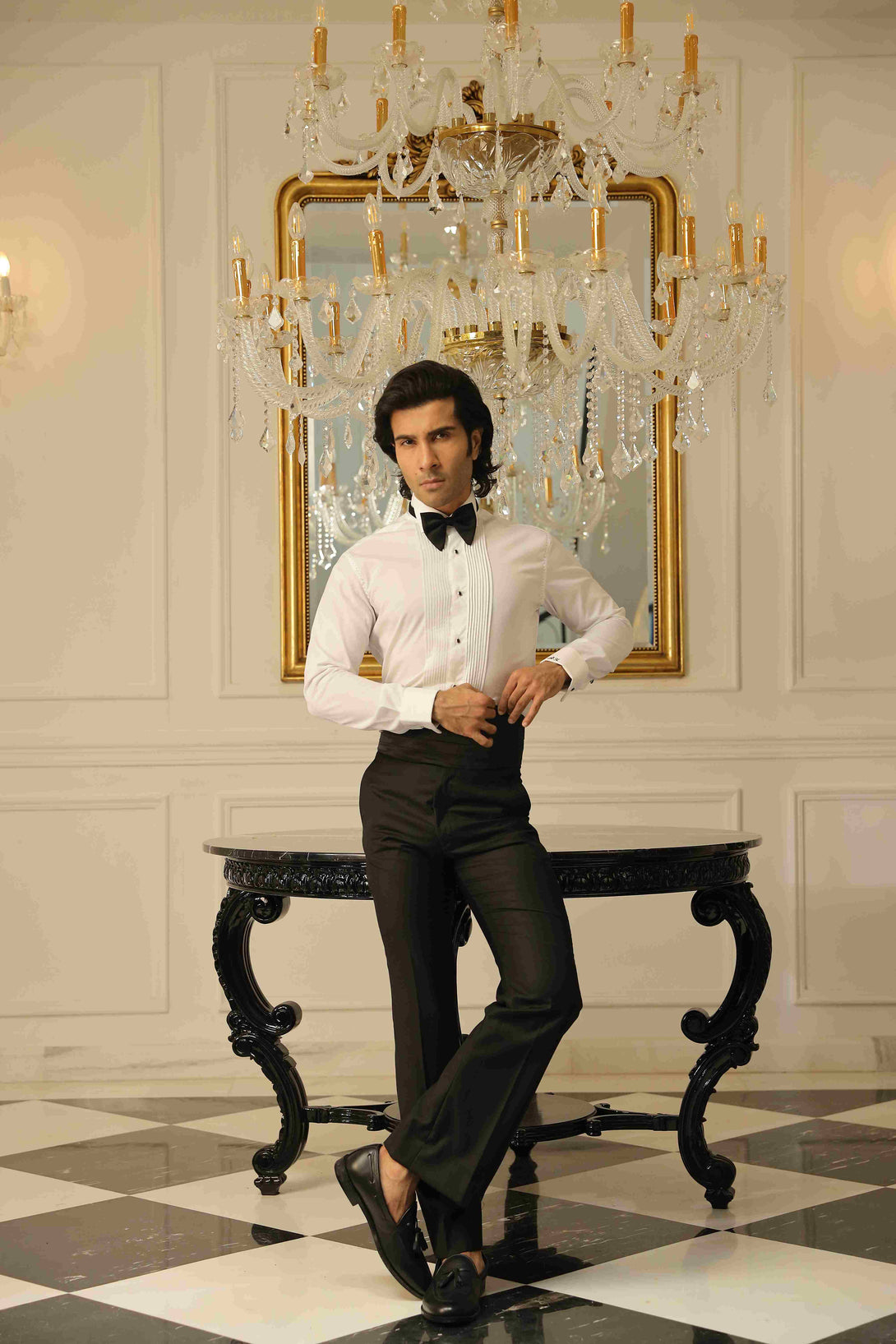 Black velvet tux with thread and handwork emplacing complete Blazer tuxedo shirt Bow tuxedo belt